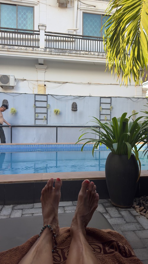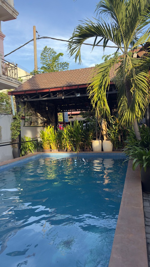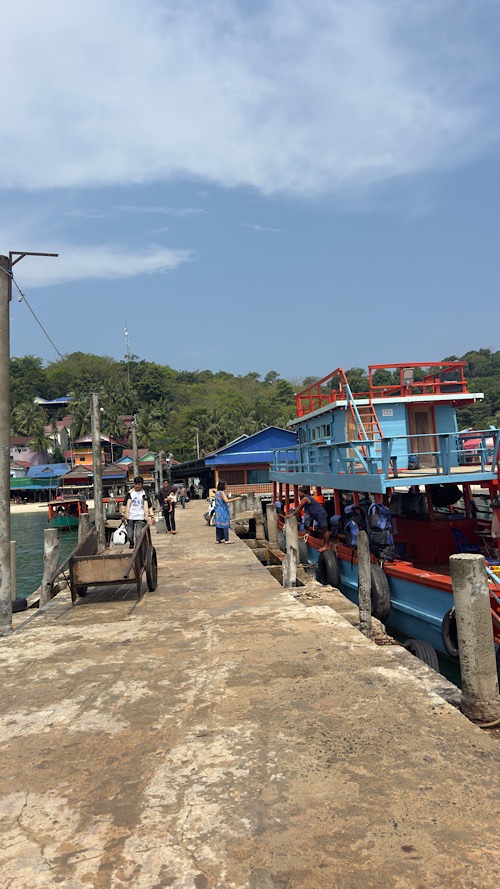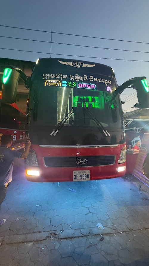 01/03/26 : Sous une chaleur écrasante avec un taux d’humidité d’approximativement 80 %, on a quand même trouvé le courage de faire une demi-journée shopping et découverte de la ville de Siem Reap. On a arpenté le marché couvert très riche en artisanat en essayant de faire la différence entre les chinoiseries et le made in Cambodge, ce n’est pas toujours évident !!! la chaleur, se faisant écrasante en milieu de journée, on a profité de la piscine de l’hôtel, en attendant notre bus en fin d’après-midi, direction les îles cambodgiennes. Nous voilà partis pour 11 heures de bus couchette avec un transfert en ferry sur l’île de koh rong Saloem. À notre grand bonheur, le bus est full confort, les couchettes doubles sont spacieuses. La clim n’est pas trop forte. Je pense qu’on va passer une super nuit…