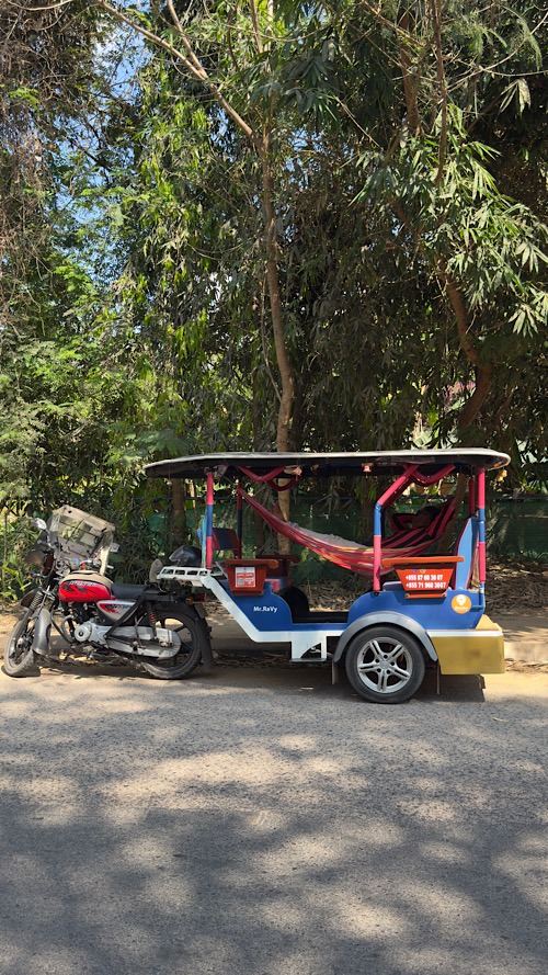 25/02/26 : Départ de Don det, destination Siem Reap au Cambodge. Comme pour le passage entre la Thaïlande et le Laos, on a opté pour un billet All inclusive qui comprend le bateau de Don det jusqu’à Nakasang puis un bus qui nous fait passer la frontière. C’est utile car les formalités peuvent être un peu lourdes. Des hôtesses facilitent l’administratif et évitent de payer les backchichs. On a le lunch compris dans le Package et tout se passe comme sur des roulettes. En début de soirée, on arrive à Siem Reap. c’est la ville d’où l’on organise les visites sur le site d’Angkor. Nous avons déniché un petit bijou d’hôtel tout près du Night Market, avec piscine,assez pratique,vu la chaleur, et chambres très spacieuses pour la modique somme de 34 € les quatre nuits!! Tropical breeze guesthouse. Le site d’Angkor est un petit bijou d’histoire et d’archéologie. Les temples de l’ancienne civilisation khmer sont datés entre le neuvième et le XIIIe siècle, le site est gigantesque (400 km²). Nous avons opté pour l’option visite en solo et en scooter. Différentes possibilités de visite avec des pass de un à sept jours, on a pris l’option trois jours ça nous semble être un minimum vu la beauté des lieux !!!!