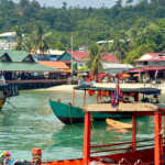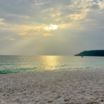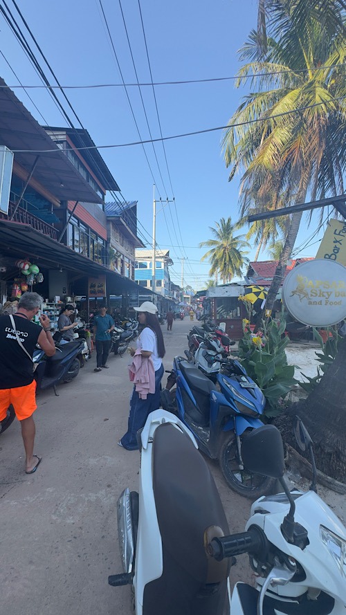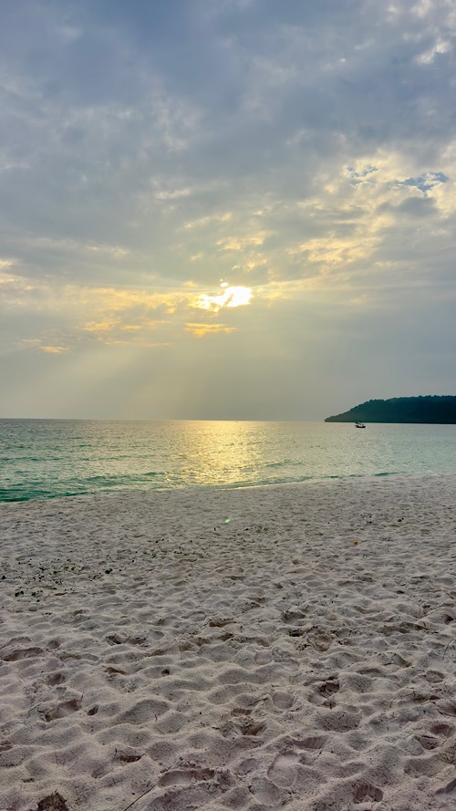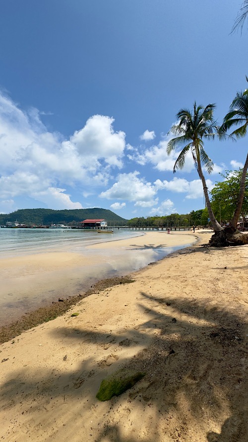Du 09/03/26 au 12/03/26 : Aujourd’hui nous changeons d’île pour trois jours et posons nos sacs à la guesthouse Soksan natura Beach. Une sublime plage de sable blanc s’étirant sur une dizaine de kilomètres, une véritable carte postale !!! Nos hôtes, une famille cambodgienne d’une extrême gentillesse, nous propose de louer un scooter pour le séjour. Bien pratique sur cette île qui possède un petit réseau routier qui facilite grandement l’exploration. L’ile, d’une superficie de 80 km² environ et trois fois plus grande que sa petite sœur Koh rong Samloem. Elle est aussi beaucoup plus développée, le village principal où se situe le débarcadère Koh touch regorge de bars, de restaurants et de boutiques en tout genre. Bien heureusement, nous sommes installés suffisamment loin de celui-ci, et bien plus au calme… cela dit il n’est pas désagréable de s’y rendre le soir pour dîner d’un bon poisson grillé et profiter de l’ambiance locale. Après avoir bourlingué pendant huit semaines, on est content de pouvoir profiter des îles cambodgiennes, surprenantes, avec des plages qui ont rien envié à celle des Seychelles !!! On peaufine notre bronzage, on se laisse bercer par l’ambiance locale plutôt zen. Bref, c’est trois jours passent à une vitesse grand V.