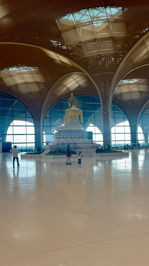 14/02/26 : Journée de transfert, départ de Nong kiaw pour Luang Prabang en minivan puis train rapide de Luang Prabang jusqu’à Ventiane. Le réseau ferroviaire est flambant neuf (2021), construit par le grand voisin chinois qui a beaucoup investi au Laos pour des raisons géopolitiques, économiques et stratégiques. En effet, c’est un moyen de relier la Chine à l’Asie du Sud est, et de concurrencer les voies maritimes majoritairement contrôlées par les États-Unis. La proximité politique (parti communiste unique) facilite les choses. C’est une sorte de partenariat dans lequel, d’un côté les Chinois peuvent exploiter certaines ressources naturelles au Laos (or, potasse…) et de l’autre les laotiens, profiter des infrastructures construites (difficilement réalisables avec leur économie limitée). La gare est immense, tout est organisé à la chinoise. Checking de sécurité, embarquement… une certaine rigueur qu’il est difficile de ne pas remarquer !!! Nous grimpons dans un train ultra moderne, un rapide qui n’a rien à envier à notre TGV et en 1 heure 50 nous voici à Ventiane, capitale du Laos. Nous allons y rester seulement une nuit et toute la journée du lendemain, puis repartir le soir, en bus de nuit jusqu’à Pakse dans le sud du pays.