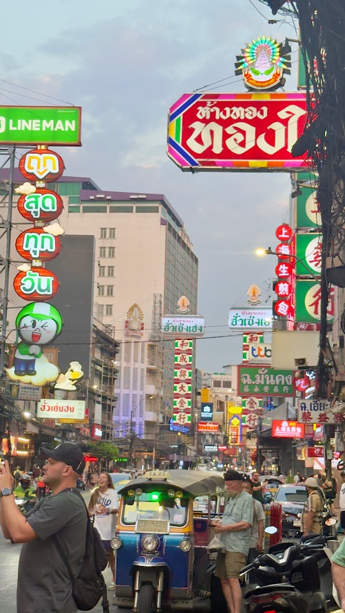 21/01/2026 : L’arrivée à Bangkok nous remémore notre premier voyage dans ce fabuleux pays qu’est la Thaïlande. 14 ans se sont écoulés, et pourtant ça semble si proche… Notre Sam❤️ avait à peine six ans et déjà un goût prononcé pour les aventures lointaines. Nous allons rester deux nuits dans cette trépidante mégapole de presque 20 millions d’habitants. On pose nos sac à dos dans le quartier de kho san road, très prisé des bacpackers du monde entier, hôtel BB house Rambuttri 2, en plein cœur du centre mais quand même très calme, un excellent rapport qualité prix. Le lendemain, après une bonne nuit réparatrice suffisante pour récupérer du Jetlag, nous voilà partis à l’autre bout de la ville pour récupérer nos billets de train pour Chiang Mai nord de la Thaïlande (car pas de e-billet pour le transport ferroviaire dans le pays.) On en profite pour tester le métro de Bangkok (assez récent, construction datant de 2004) c’est très pratique, rapide, économique et écologique !! que demande le peuple !!! Nous passons le restant de la journée à déambuler dans le quartier de Kho San road très animé et à la tombée de la nuit carrément dévergondé… ce n’est certainement pas l’endroit le plus authentique de Thaïlande mais ça mérite quand même de s’y attarder le temps d’une soirée.